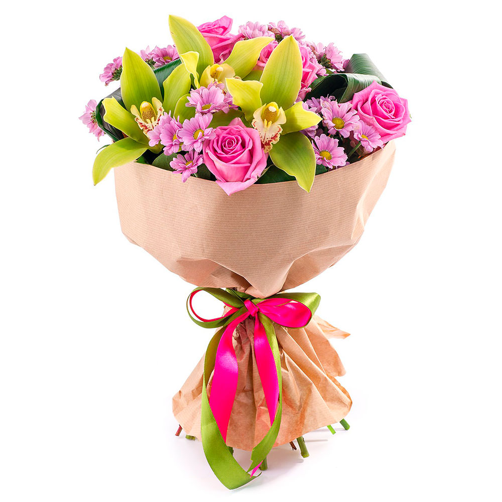 На фото представлен образец. Объем букета зависит от выбранного вами размера. Точное количество цветов и цветовую гамму вы можете уточнить у менеджера по телефону.